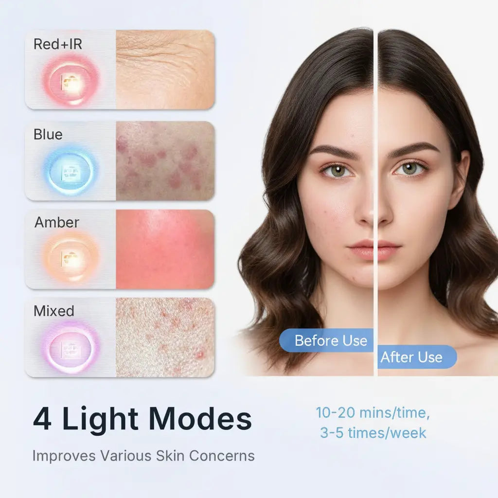 Intelligent Controls + Memory: 4 light modes, 3 intensity levels, and 4 timer options (5/10/15/20 min). Remembers your last setup for effortless daily use.